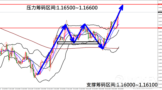 今日欧元/美元(10月19日)早盘在1.16088附近,从技术分析面切入,1小时级别观察走势架构符合昨日(18日)预测K棒出现拉回修正行情,随后反弹上涨,目前K棒落在布林通道中轨与上轨之间,同时开口转折朝上,因此有机会持续反弹上涨。