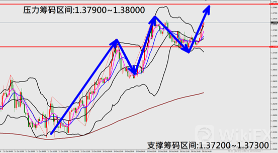今日英镑/美元(10月19日)早盘在1.37260附近,从技术分析面切入,1小时线级别观察走势昨日(18日)K棒持续冲高上涨,随后高点遇压拉回修正,目前K棒落在布林通道中轨与上轨之间,同时开口转折朝上,因此有机会持续反弹上涨。