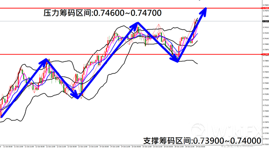 目前短线上方压力区间位于0.74600~0.74700,下方初步支撑区间于0.73900~0.74000,操作心态偏短多为主,想进场做短多的投资者可考虑在0.74300至0.74380区间轻仓买进,止损点位可考虑设置0.74200下方。