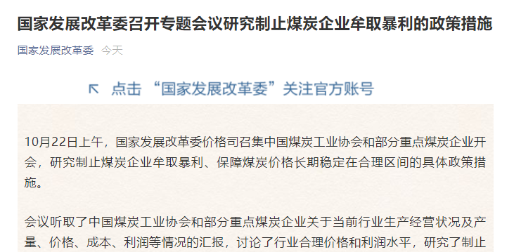 10月22日,国家发改委微信公众号发文表示,当日,国家发改委召开专题会议,研究制止煤炭企业牟取暴利的政策措施。这是继19日、20日、21日以来,国家发改委连续第4次表态煤价。