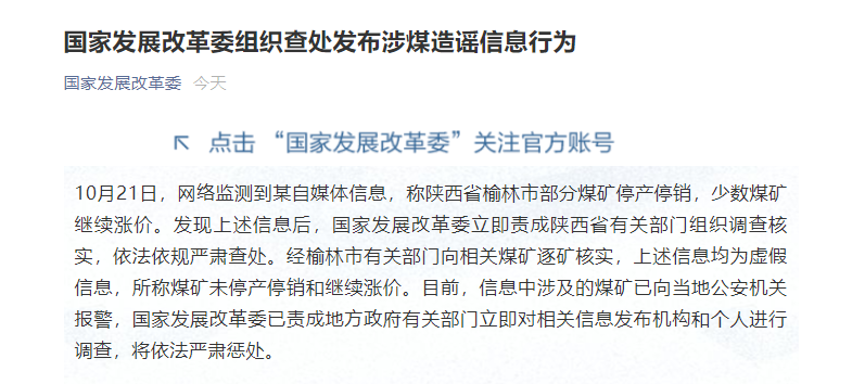 同一天,国家发改委微信公众号还发文称,监测到自媒体称陕西省榆林市部分煤矿停产停销,少数煤矿继续涨价,上述信息均为虚假信息。