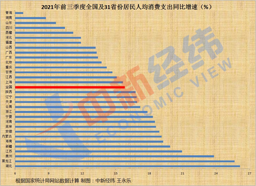 从同比名义增速来看,计算发现,前三季度31省份人均消费支出均实现正增长。湖北、黑龙江、贵州、江苏、新疆、海南、内蒙古、安徽、吉林、河南、宁夏、浙江、云南、天津、辽宁、陕西等16省份均超全国15.8%的增速。