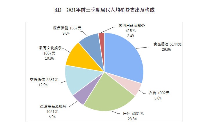 从支出及构成数据来看,食品烟酒和居住支出占前三季度人均消费支出的“大头”。其中, 食品烟酒支出为5144元,占比为29.8%;居住支出为4031元,占比为23.3%。