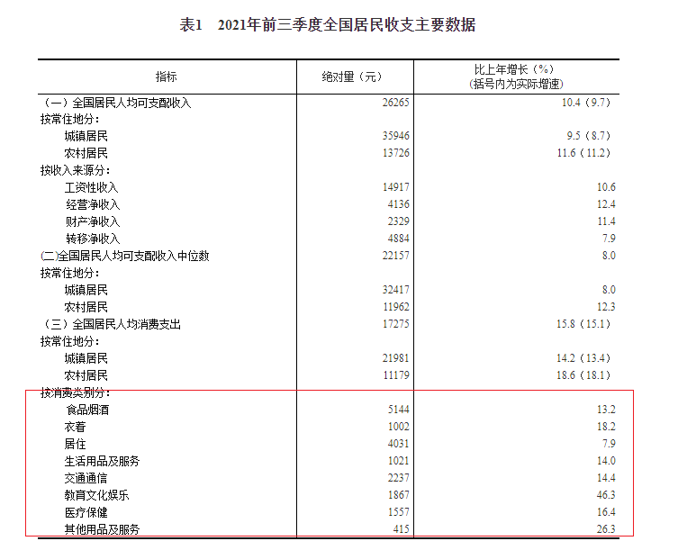 在人均消费支出增速方面,教育文化娱乐支出增长最快,增速46.3%;其他用品及服务支出增速为26.3%;食品烟酒、衣着、生活用品及服务、交通通信、医疗保健等5项支出增速均超10%。