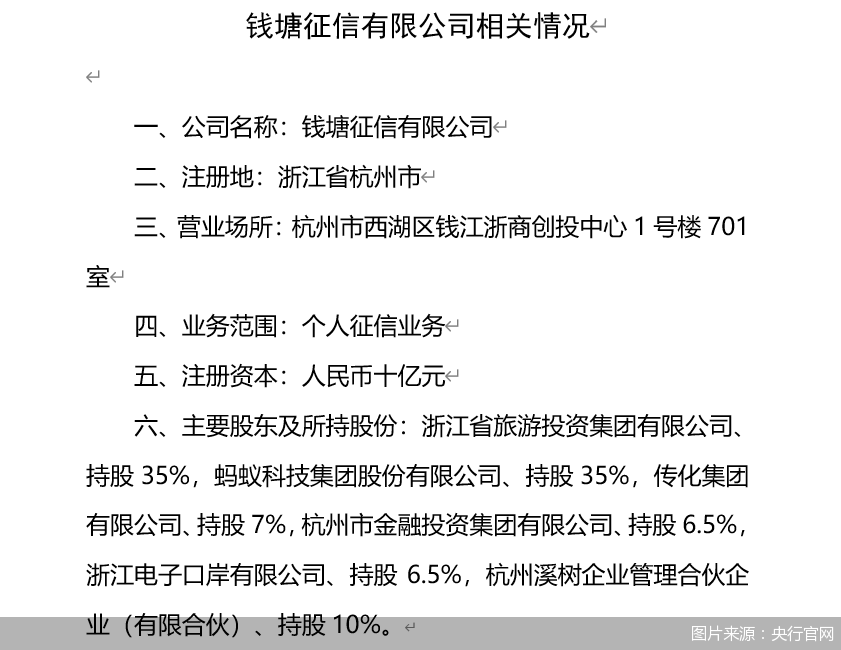 另外看看钱塘征信的主要股东及所持股份:其中,浙江省旅游投资集团有限公司(以下简称“浙旅集团”)持股35%,蚂蚁科技集团股份有限公司持股35%,传化集团有限公司持股7%,杭州市金融投资集团有限公司持股6.5%,浙江电子口岸有限公司持股6.5%,杭州溪树企业管理合伙企业(有限合伙)持股10%。