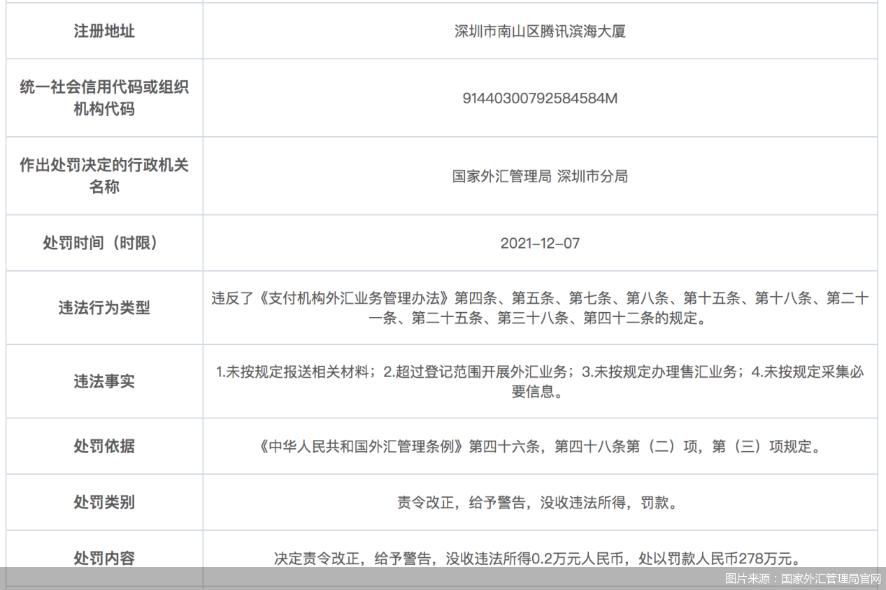 在被处罚的机构中,微信支付的运营主体财付通支付科技有限公司(以下简称“财付通”),因存在未按规定报送相关材料、超过登记范围开展外汇业务、未按规定办理售汇业务以及未按规定采集必要信息等行为,被给予警告,没收违法所得0.2万元人民币,处以罚款人民币278万元。