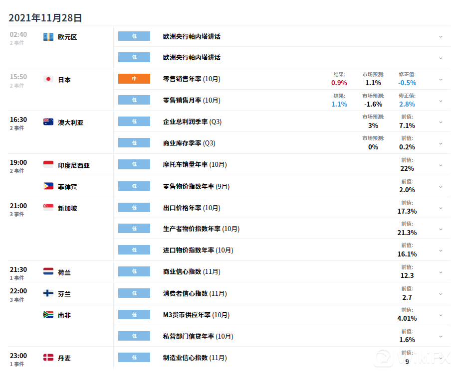虽然没有重大数据披露,但南非新型病毒Omicorn引发市场巨震,美指跌0.72%,收于96.055,欧元日元瑞郎波动均创新高,主要是由于市场避险情绪上扬,在未知目前病毒是否会在全世界范围传播以及疫苗是否有效的情况下,没有任何机构可以预测各国央行是否会因此调整缩债加息议程,尤其是通胀水平高涨的情况下,新一轮可能的全球封锁对于经济恢复的打击将是致命的。同样受新病毒恐惧影响,如果目前刚刚恢复的全球物流再一次受封锁打击,已经高企的人工成本以及运输成本将进一步减少原油的供给,市场的忧虑促使原油价格大幅跳空,收于68美元/桶。