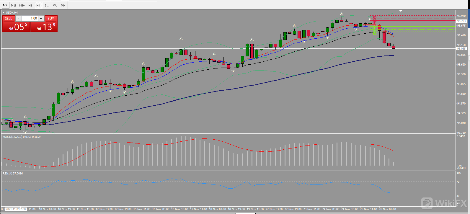 日线图虽然回落,但RSI维持61,在95.561点位被破前上涨通道保持完整,布林带预计收紧,短期价格为震荡形态。