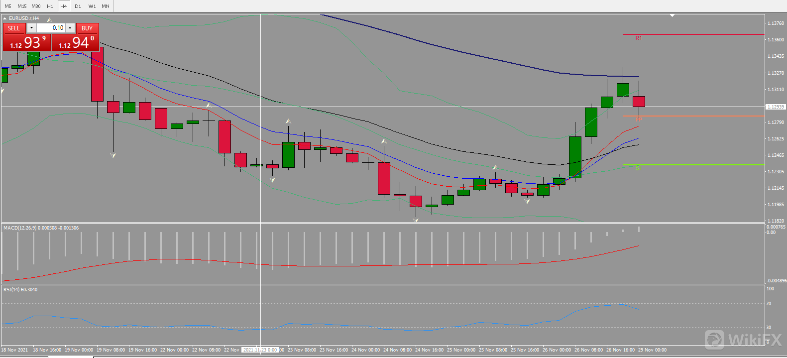 4小时图价格得到纠正,主要为空头止盈,布林带打开预示价格短期见底,预计震荡区间1.12361-1.13635.