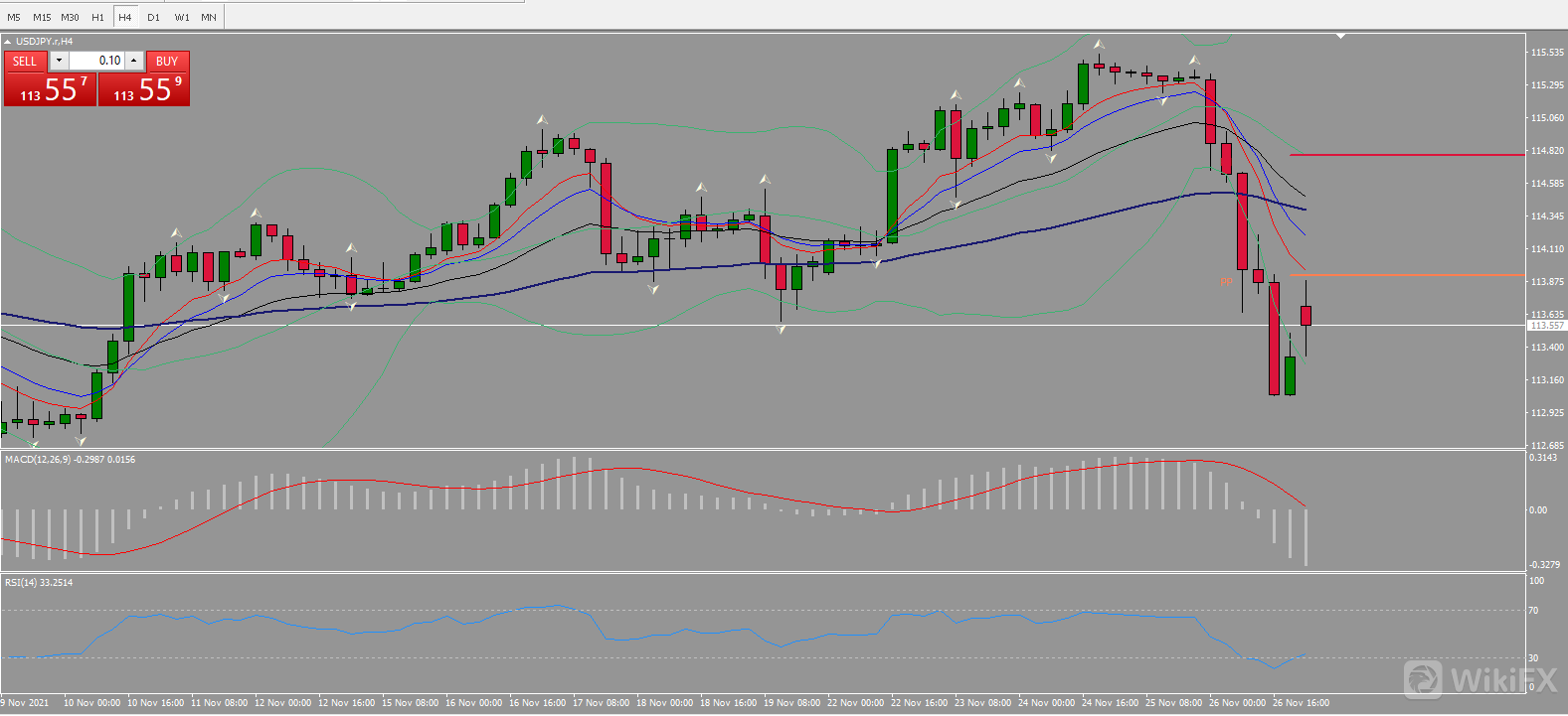4小时图同日线图接近,价格在超卖区反弹,蓄势第二波下跌,布林带打开后又现收缩趋势,目前并无出现明显反弹需求,看向支撑位112.433一线。