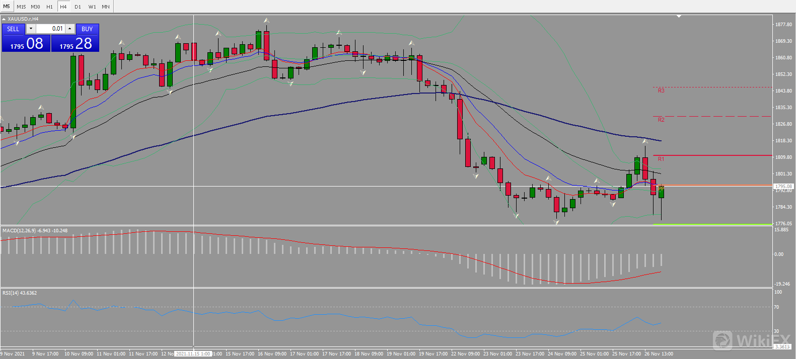 4小时图呈W形,见底1778.49,RSI从超卖区间回归,布林带收紧,价格同时触及上轨1808点位以及下轨1780点位,整体未来预计迎来盘整,支撑位1775.62。
