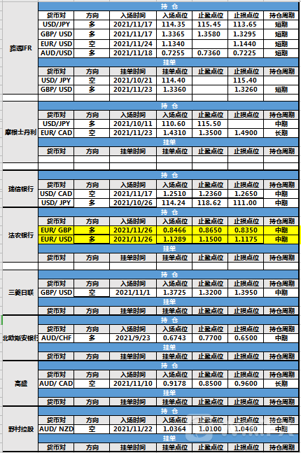 持仓方面,法农银行两仓位调整。欧元兑英镑入场点位调整至0.8466,止盈点位调整至0.8650,止损点位调整至0.8350,目前处于持仓中。欧元兑美元入场点位调整至1.1289,止盈点位调整至1.1500,止损点位调整至1.1175,目前处于持仓中。