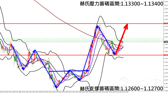 今日欧元/美元(11月30日)早盘在1.12920附近,从技术分析面切入,1小时级别观察走势架构昨日(29日)K棒出现拉回修正走势,随后反弹上涨,目前K棒落在布林通道中轨附近震荡,同时开口转折朝上,因此有机会出现反弹上涨走势。