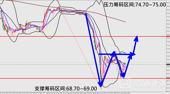 今日美国原油(11月30日)早盘在69.94附近,从技术分析面切入,1小时线级别观察走势架构昨日(29日)K棒出现反弹遇压拉回修正,目前K棒落在布林通道中轨附近震荡,同时开口呈现缩口,因此有机会出现跌深反弹上涨走势。