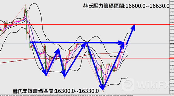 今日纳指(11月30日)早盘在16427.7附近,从技术分析面切入,1小时线级别观察走势架构符合昨日(29日)预测K棒拉回修正后出现反弹上涨行情,目前K棒站上布林通道中轨上方,同时开口持续向上,因此有机会持续反弹上涨。