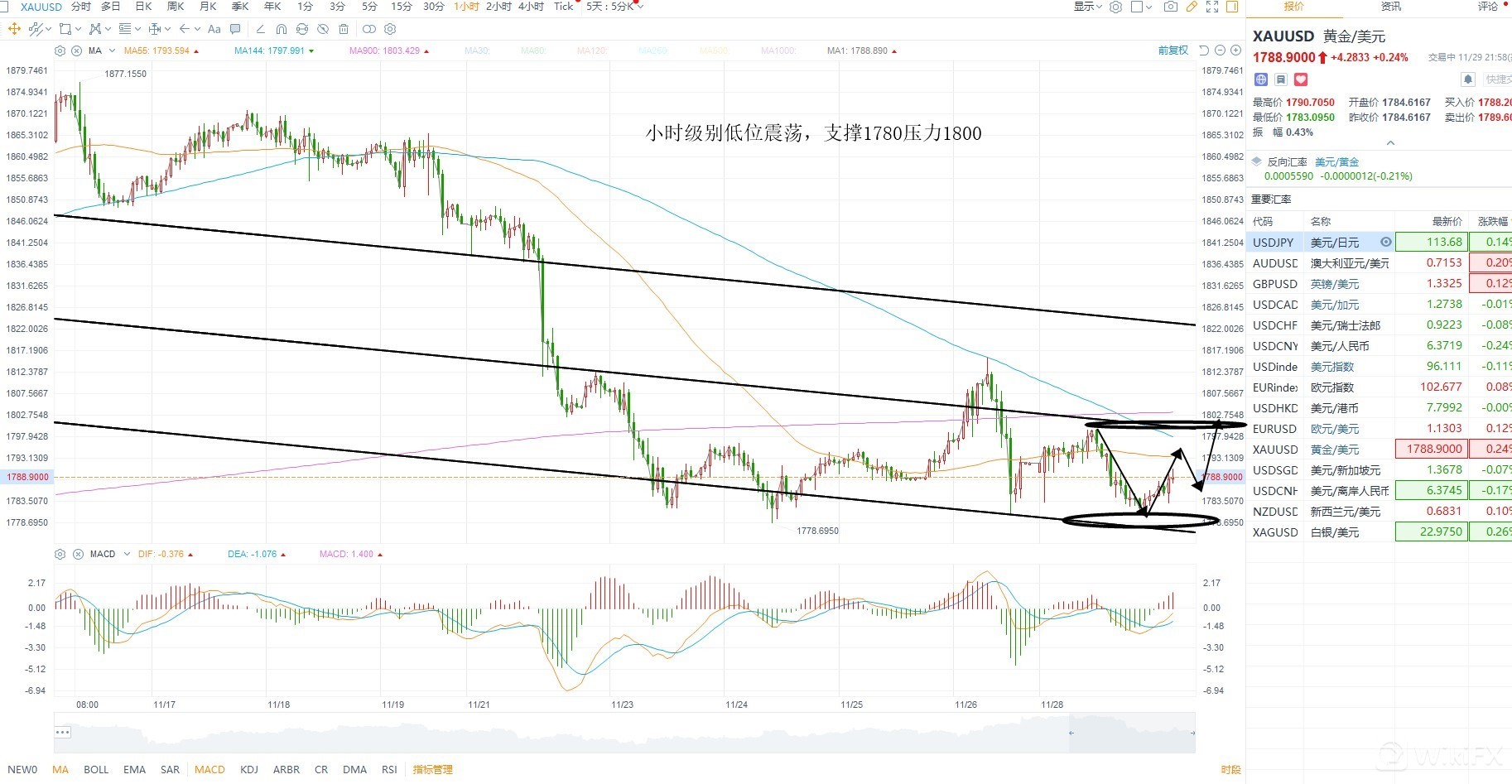 黄金短期低位震荡,从目前结构上来看,依然是震荡偏空,但下方支撑1780依然有效,所以在非农数据之前,很难给出明确的方向,基本面上避险情绪未能推动价格走高,而美元依然是多头强势,不利金价走高,技术层面上1780不破,存在反弹的需求,小时级别反弹压力1800,若站上1800则有望测试前期反弹高点1815附近