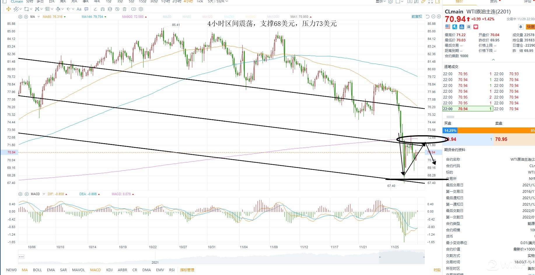美原油快速杀跌之后低位震荡,考虑到避险情绪消散,且快速杀跌之后存在反弹修正的需求,若短期共振纳斯达克指数等风险资产反弹,则不排除再次测试75美元附近压力的可能性,基本面上需要关注库存数据的变化,若EIA库存继续维持增长,则不利油价走高,大方向上已经从多头转入震荡,维持区间思路,短期重要支撑68美元,上方压力73美元,等待方向选择