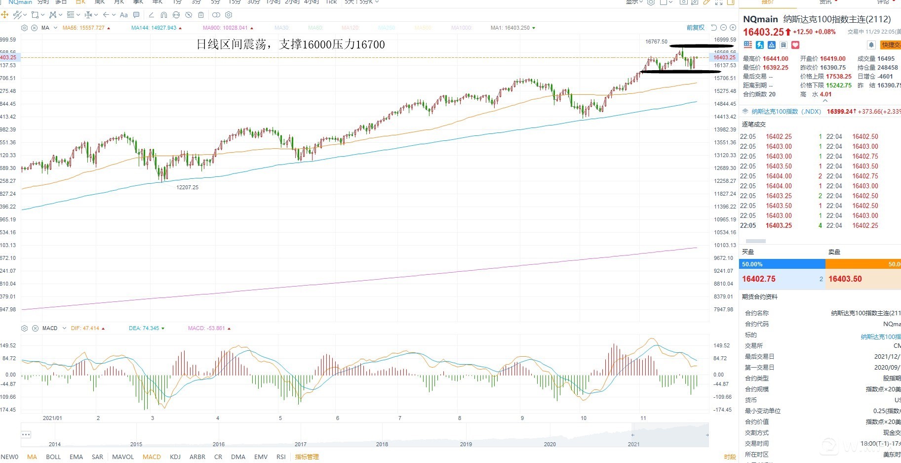 纳斯达克指数收回周五跌幅,从目前情绪上来看,对于周五的波动只是放大,而并不是方向选择,主要还是看加息预期是否进一步推动指数走强,技术层面上维持区间震荡,目前基本面不支持新高加速,因此维持区间思路,短期重要压力前高16700附近,下方支撑16000等待方向选择