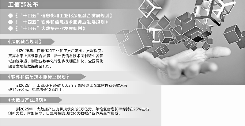 11月30日,工业和信息化部发布《“十四五”信息化和工业化深度融合发展规划》(下称《深度融合规划》)、《“十四五”软件和信息技术服务业发展规划》(下称《软件和信息技术服务业规划》)、《“十四五”大数据产业发展规划》(下称《大数据产业规划》)。