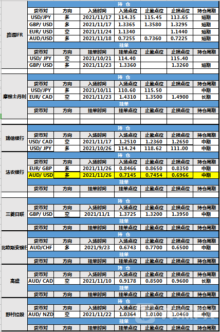 持仓方面,法农银行澳元兑美元仓位调整,入场点位调整至0.7145,止盈点位调整至0.7454,止损点位调整至0.6966,目前处于持仓中。