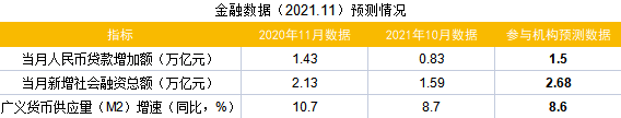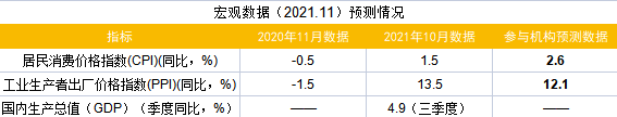 调查数据显示,预估国内11月CPI同比将上行至2.6%附近,PPI将回落至12.1%;当月人民币新增贷款和社会融资规模将反弹至1.5万亿元和2.68万亿元左右;M2同比增速预计8.6%左右。