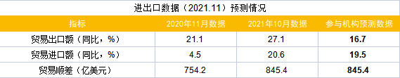 参与预测机构对于贸易出口额同比增速的预测最高值为18.1%,最低值为14%,中值16.7%;对贸易进口额同比增速的预测最高值25%,最低值14.2%,中值为19.5%;对于贸易顺差的预测最高值为987亿美元,最低为780亿美元,中值为845.4亿美元。