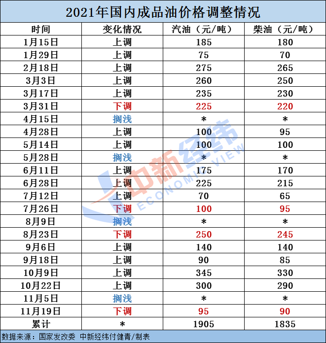 据中新经纬梳理,今年以来,国内成品油价格已进行了二十二轮调整,累计“十四涨四跌四搁浅”,汽油价格累计上调1905元/吨,柴油价格累计上调1835元/吨。在已经下调的四次价格中,最大幅度为8月23日进行的调整,其中汽油每吨下调250元,柴油每吨下调245元。如果本轮调整落实,将是年内第五次下调。
