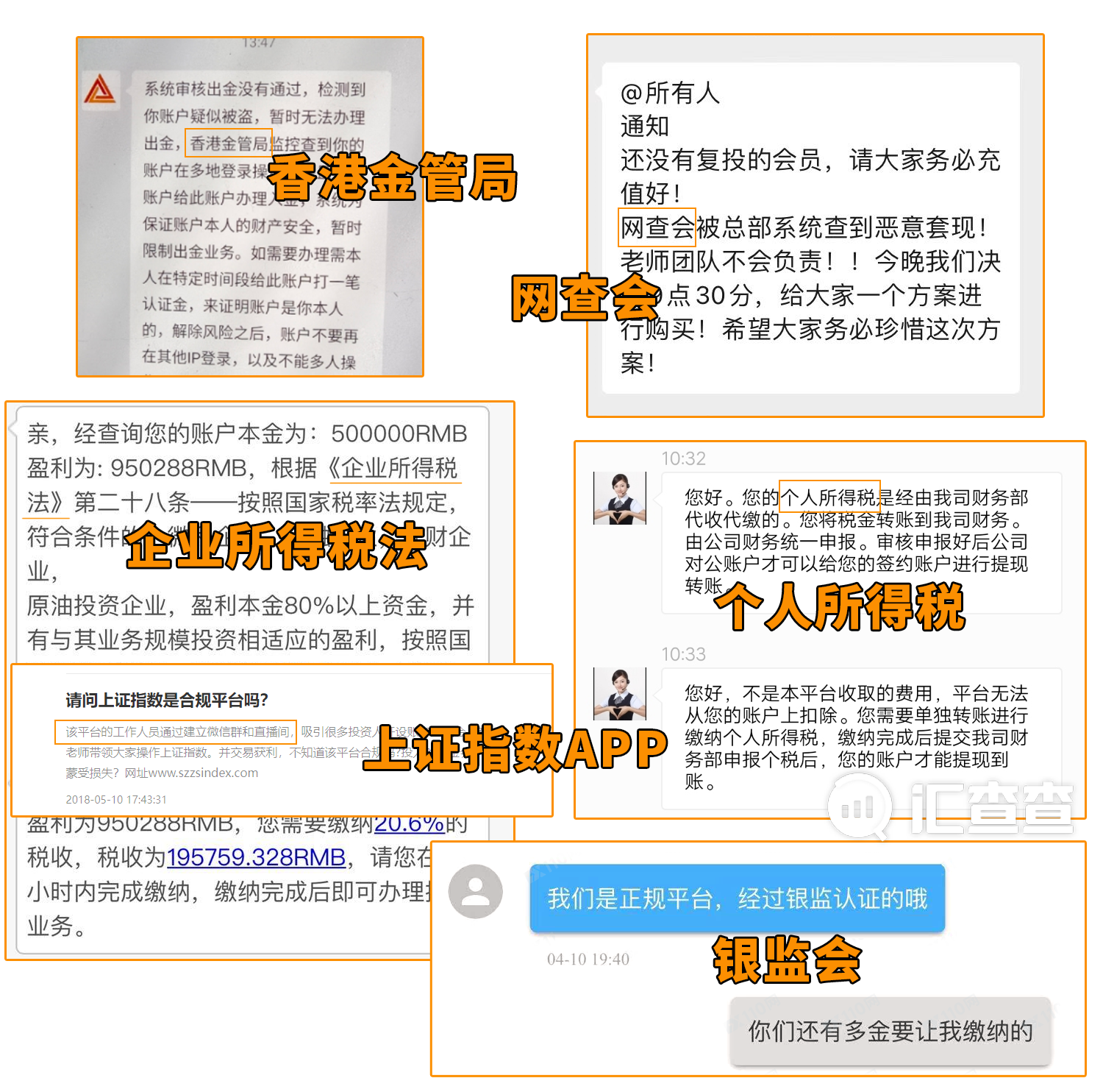 网查会、香港金管局、个人所得税、上证指数APP、银监会……这些巧立名目的机构或缴费名称,成为黑平台百试不爽的威胁说辞。