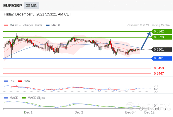 RSI技术指标大于中性区域50。MACD技术指标处在其信号线之上看空。另外,价位低于其50天移动平均线(0.8505)但高于其20天移动平均线(0.8498)。