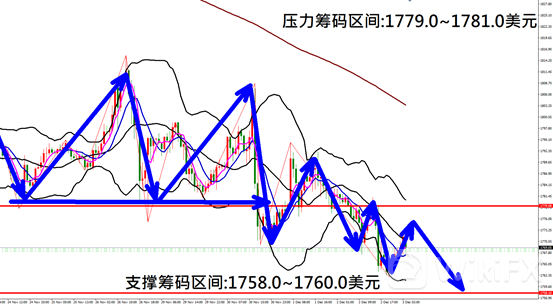 今日黄金(12月3日)早盘在1768.0美元/盎司附近,从技术分析面切入1小时级别观察走势架构昨日(2日)K棒落出现大幅向下修正走势,目前K棒落在布林通道中轨与下轨之间,同时布林通道开口持续朝下,因此有机会持续向下修正。