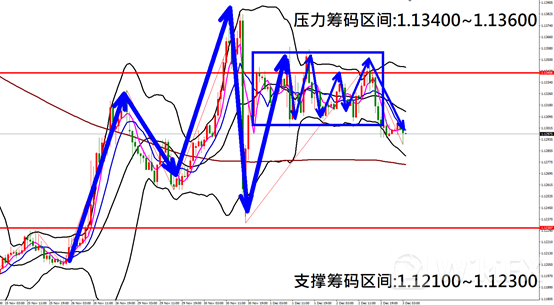 今日欧元/美元(12月3日)早盘在1.13005附近,从技术分析面切入,1小时级别观察走势架构昨日(2日)K棒高点狭幅震荡后,出现向下修正行情,目前K棒落在布林通道中轨附近震荡,同时开口持续朝下,因此有机会持续向下修正。