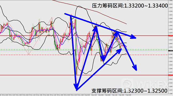 今日英镑/美元(12月3日)早盘在1.32992附近,从技术分析面切入,1小时线级别观察走势昨日(2日)预测K棒出现反弹走势,随后拉回修正,目前K棒落在布林通道中轨下方,同时开口转折朝下,因此有机会再度向下修正。