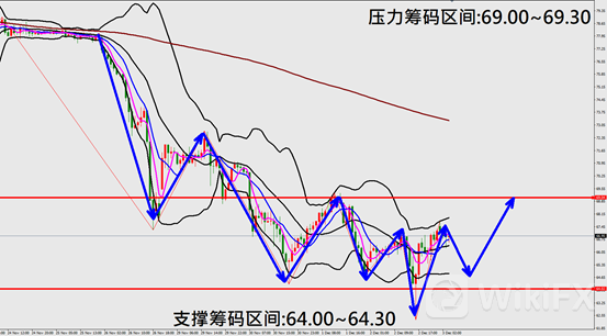 目前短线上方压力区间位于69.00~69.30,下方初步支撑区间于64.00~64.30,操作心态偏短多为主,想进场做短多的投资者可考虑在66.80至67.10区间轻仓进场,止损点位可考虑设置66.50下方。