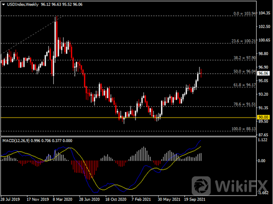 周线图显示美元指数小幅收跌,当前持稳于96.05阻力。从MACD来看,快慢线向上扩张,白色动能柱温和放量。指数走势和动能柱的变化呈分歧。