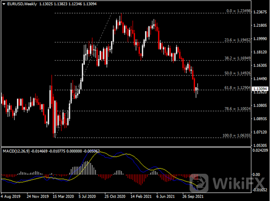 周线图显示欧元兑美元跌势暂缓,当前持稳于1.1290支撑。 从MACD来看,快慢线向下运行,红色动能柱温和增量。汇价走势和动能柱的变化呈分歧。