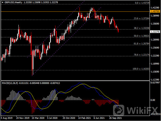 周线图显示英镑兑美元震荡下跌,当前收于前低1.3325。 从MACD来看,快慢线向下运行,红色动能柱温和放量。汇价走势基本和动能柱的变化一致。