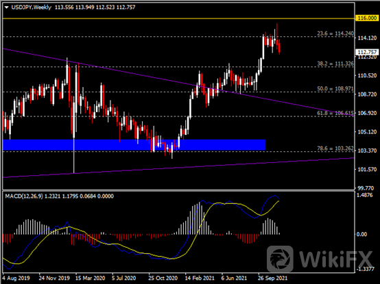 周线图显示美元兑日元高位回调,当前承压于114.25阻力。从MACD来看,快慢线欲形成死叉,白色动能柱持续收缩。汇价走势基本和动能柱的变化一致。