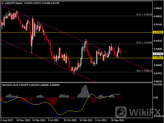 周线图显示美元兑瑞郎震荡下跌,当前承压于0.9370阻力。 从MACD来看, 快慢线呈拐向,红色动能柱略恢复增量。汇价走势基本和动能柱的变化一致。