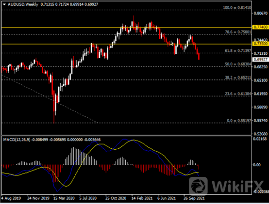 周线图显示澳元兑美元空头承压,当前收于前低0.7140。 从MACD来看,快慢线死叉依旧,红色动能柱温和放量。汇价走势基本和动能柱的变化一致。