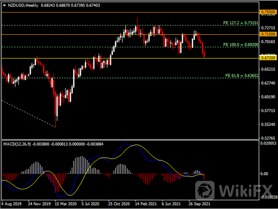 周线图显示纽元兑美元持续走弱,当前测试0.6720支撑。从MACD来看,快慢线死叉依旧,红色动能柱温和增量。汇价走势基本和动能柱的变化一致。