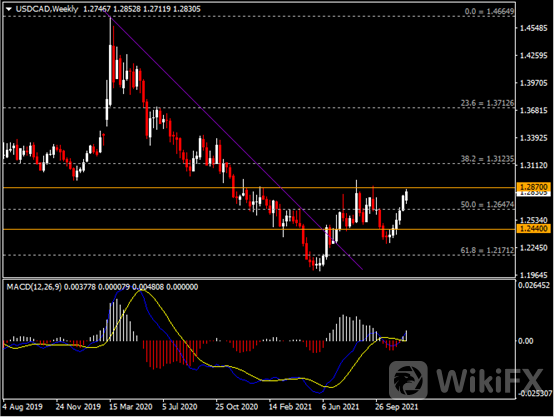 周线图显示美元兑加元持续走高,当前测试1.2870区间阻力。从MACD来看,快慢线金叉依旧,白色动能柱温和放量。汇价走势基本和动能柱的变化一致。