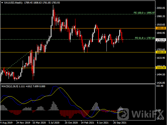 周线图显示金价震荡下跌,当前测试1785支撑。从MACD来看,快慢线呈拐向,白色动能柱温和收缩。金价走势基本和动能柱的变化一致。