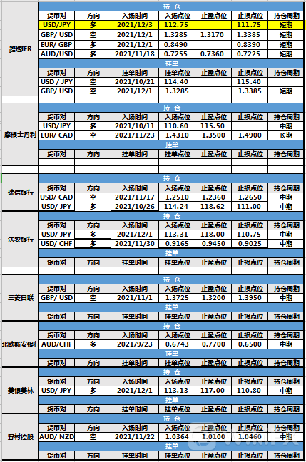 持仓方面,路透IFR美元兑日元仓位调整,入场点位调整至112.75,止损点位调整至111.75,目前处于持仓中。