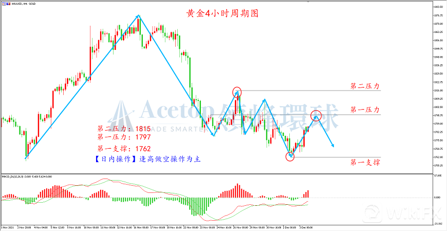 从黄金4小时周期图来看,黄金近期走出震荡下行的技术结构,尽管短期走出强劲的反弹,但依旧没有改变下跌趋势。短线MACD指标红色动能柱依旧向上发散,预计反弹还将延续。但MACD双线指标处于0轴下方,反弹也是弱反弹。短线目标可以看前期1780-1797的压力区间,预计在此位置受阻的概率较大。建议投资者尝试在1797附近布局空单。