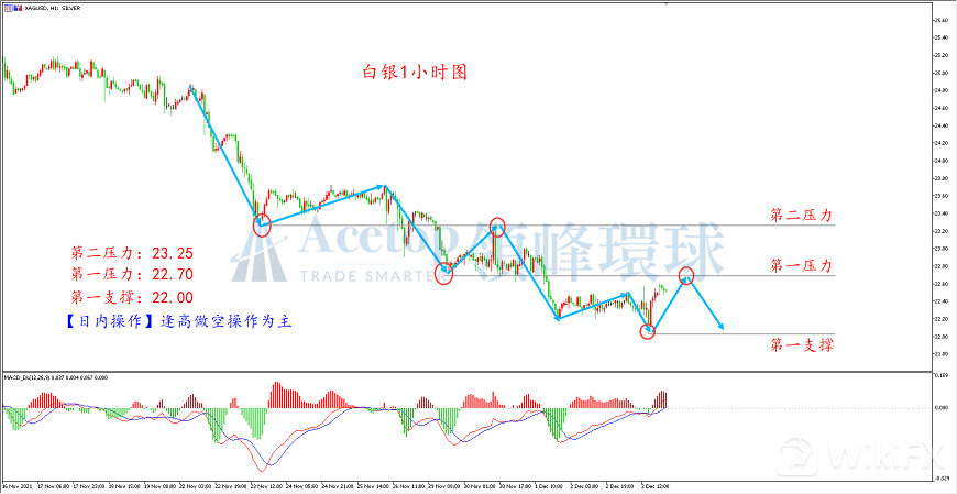 从白银1小时周期图看,白银整体处于一个震荡下行的技术结构当中。整个下跌趋势当中,高低点都在都在不断下移。短线MACD技术指标红色动能柱冲高后逐渐缩短,预计反弹力度将逐渐减弱。当前下跌趋势并没有改变,预计反弹后回落概率依然较大。后期可以关注前期高点压力22.70附近,投资者可以尝试在此位置布局空单。