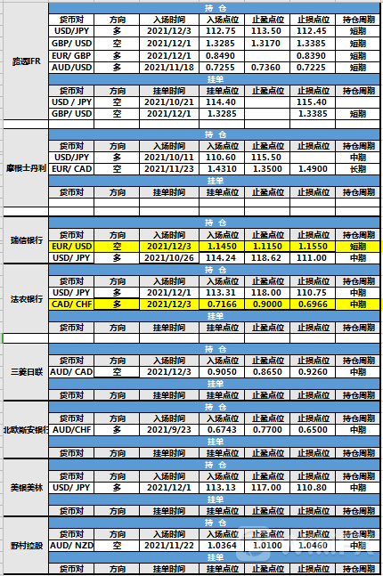 持仓方面,瑞信银行、法农银行两投行仓位调整。瑞信银行欧元兑美元入场点位调整至1.1450,直营部点位调整至1.1150,止损点位调整至1.1550,目前处于持仓中。法农银行加元兑瑞郎入场点位调整至0.7166,止盈点位调整至0.9000,止损点位调整至0.6966,目前处于持仓中。