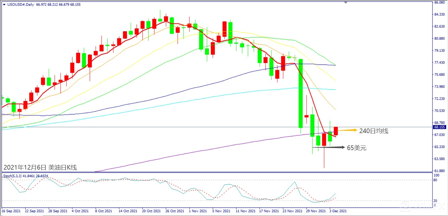 日级别线图,近期在65美元上方震荡,反弹突破240日均线,有望出现连续上涨。