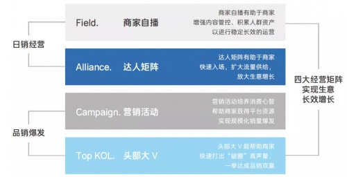 另外,为了满足品牌的个性化需求,抖音电商官网提出了FACT矩阵。具体说明为四点:F (Field) 商家自播的阵地经营、A (Alliance) 海量达人的矩阵经营、C (Campaign) 营销活动的组合爆发、T (Top-KOL) 头部大V的品销双赢。整体来说,商家自播 (Field) 和达人矩阵 (Alliance) 用于构建稳定的日常销量,而营销活动 (Campaign) 和头部大V (Top KOL) 用于实现规模化的品销爆发。商家可以基于不同阶段的GMV增长需求,灵活分配四大经营阵地的运营资源与营销投入,实现抖音电商生意总量稳定、高效的持续增长。