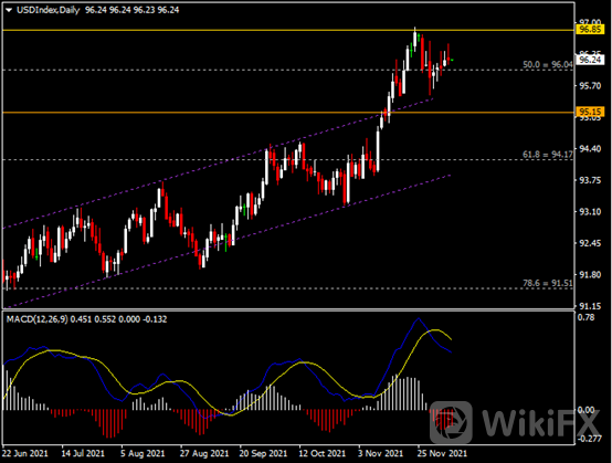 日线图显示美元指数小幅收跌,当前仍持稳于96.00支撑。从MACD来看,快慢线向下运行,红色动能柱则温和收缩。指数走势和动能柱的变化稍呈分歧。