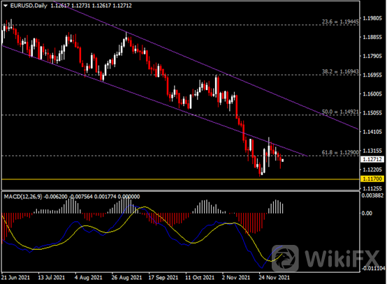 日线图显示欧元兑美元震荡下挫,当前略收于前低1.1300。从MACD来看,快慢线向上运行,白色动能柱则温和收缩。汇价走势基本和动能柱的变化一致。
